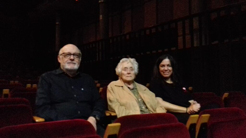 En Miquel, la Roser i la Cristina, davant l’entrada del teatre.
